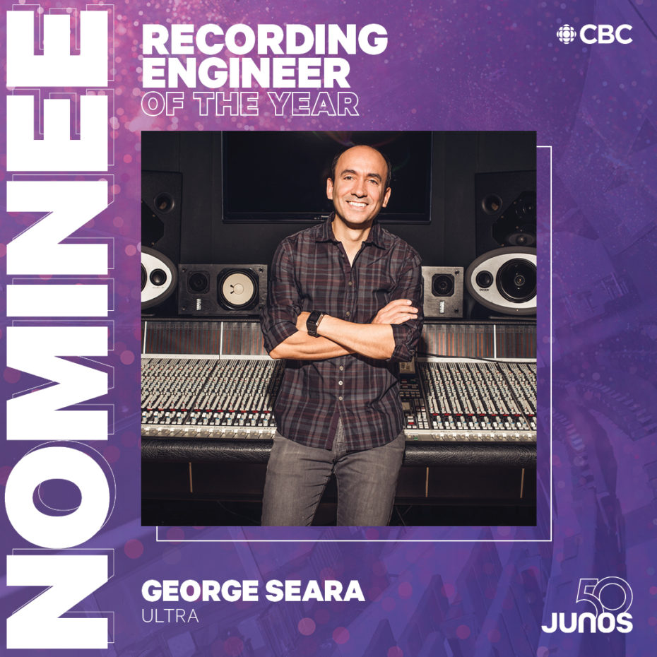 GEORGE SEARA IS NOMINATED IN THE ‘RECORDING ENGINEER OF THE YEAR’ CATEGORY AT CANADA’S 2021 JUNO AWARDS